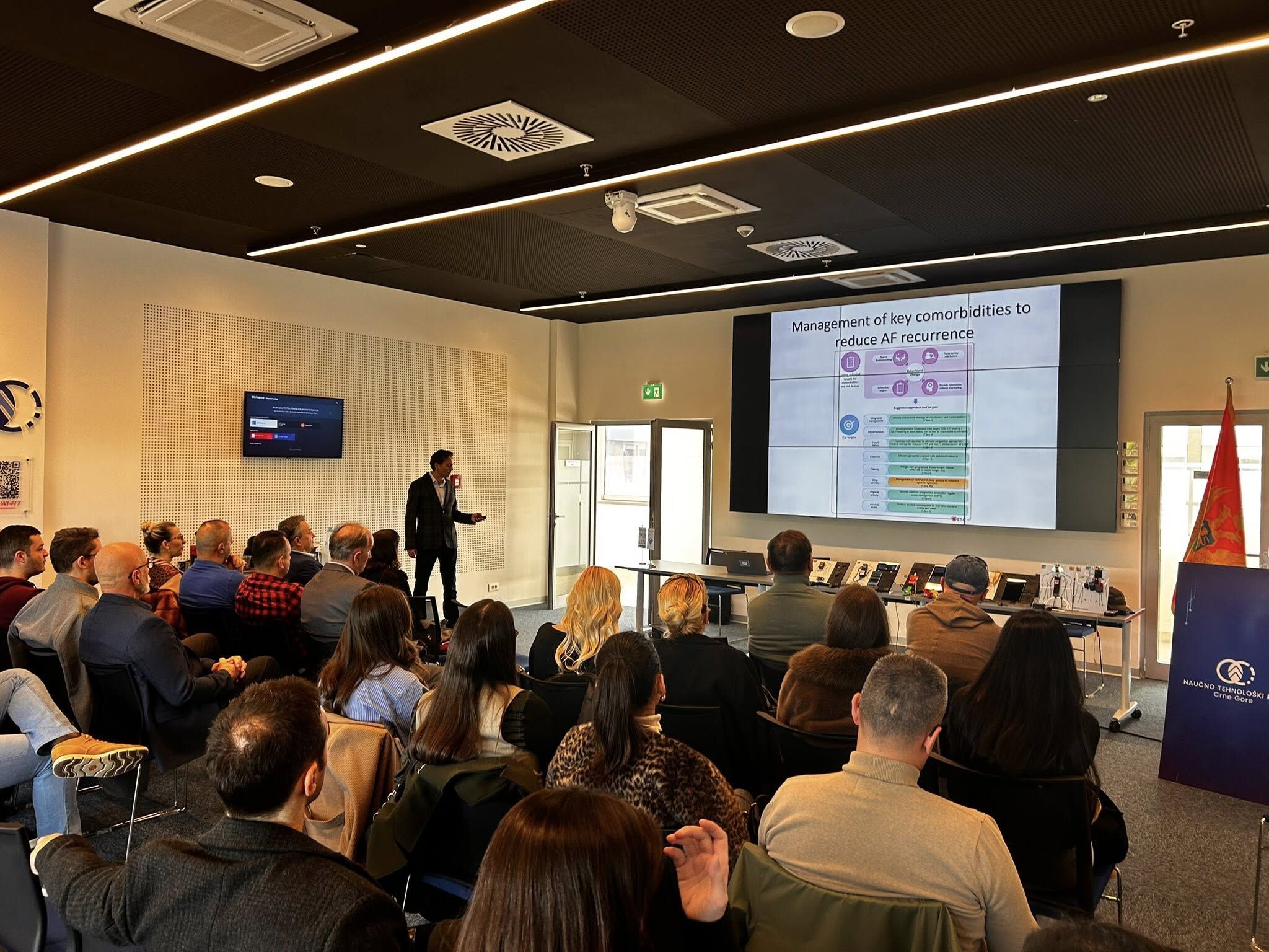 Demonstraciju uređaja i nadahnuta predavanja prof. dr Radovana Stojanovića, doc dr Mihaila Vukmirovića i prof. dr Vesne Miranović, pratile su diskusije na teme: tehnike i informacione tehnologije u zdravstvu, načina liječenja savremenih bolesti – pogotovo aritmija, uloga AI u zdravstvu, ali i potrebe i mogućnosti za unaprijeđenje zdravstva u kroz savremene tehnologije.